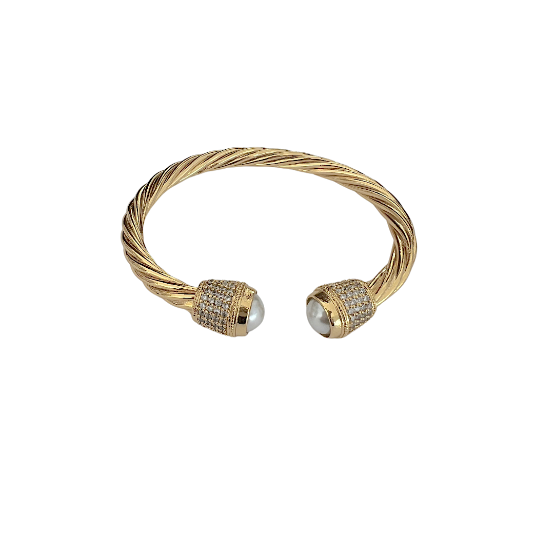 This chic cuff bracelet sparkles with rhinestones along the band, leading to radiant rhinestone accents at each end. Finished with a lustrous pearl on both sides, it blends classic elegance with modern sparkle. Perfect for adding a refined touch to any look.